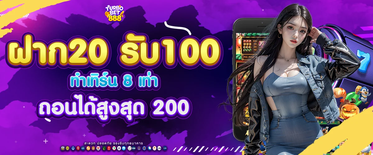 ฝาก 20 → รับเพิ่ม 80 = รวม 100 / ทำเทิร์น 8 เท่า / ถอนได้สูงสุด 200